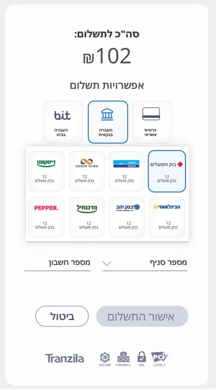 אפשרות של העברה בנקאית מצטרפת בדף התשלום כבחירה לצד אמצעי התשלום האחרים.
