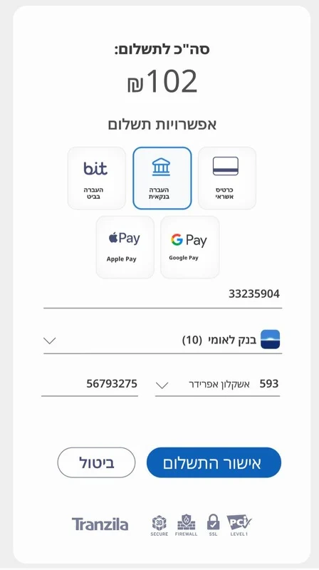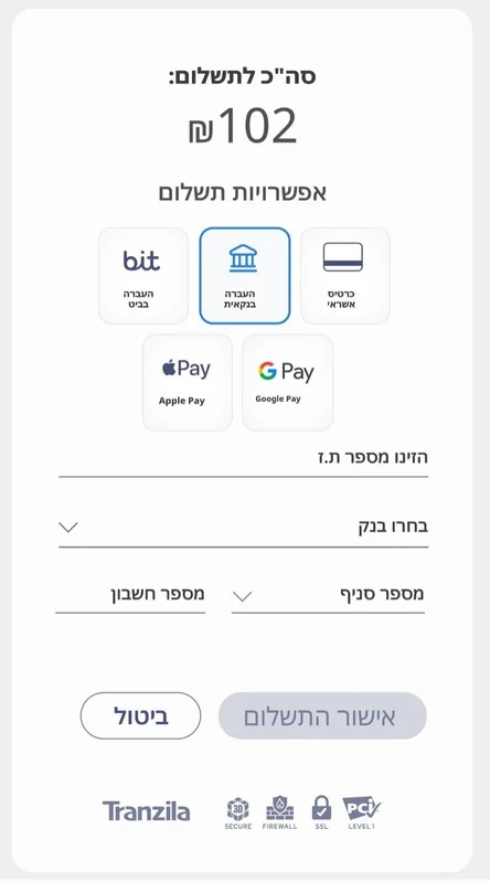 אפשרות של העברה בנקאית מצטרפת בדף התשלום כבחירה לצד אמצעי התשלום האחרים.